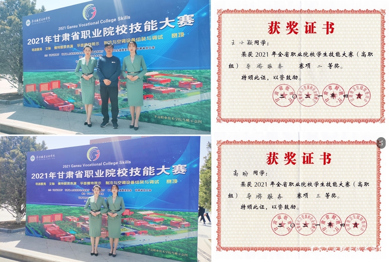 导游服务赛项作为我校传统优势赛项,近两年来成绩斐然,在甘肃省职业院校技能大赛导游服务赛项已获得一等奖1项,二等奖3项,三等奖1项,在全国旅游院校服务技能(导游)大赛获得二等奖1项,三等奖2项,比赛成绩稳居全省前列。