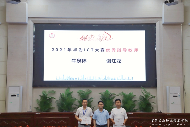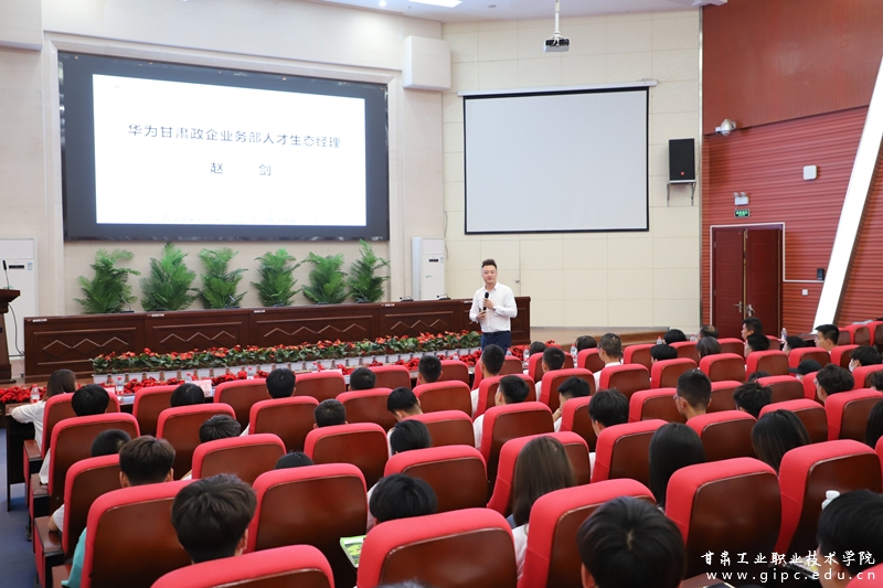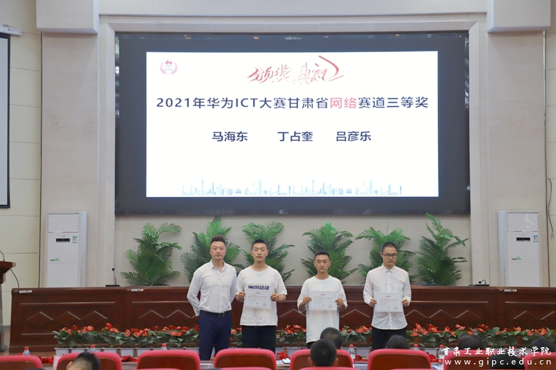 活动中,我校电信学院院长张燎致辞,华为甘肃代表处政企业务部人才生态经理赵剑为我校学生在2021年华为ICT大赛甘肃省网络赛道获奖学生颁奖,张燎为获得2021年华为ICT大赛优秀指导教师颁奖。