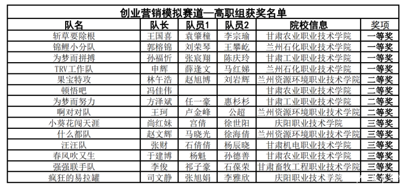 5月20日,由甘肃省教育厅主办、兰州财经大学承办,高等学校国家级实验教学示范中心联席会经济与管理学科组、中国陶行知研究会指导,杭州贝腾科技有限公司技术支持的第十届“学创杯”全国大学生创业综合模拟大赛甘肃省选拔赛在兰州财经大学举行,全省34所高校181支代表队参加,经过学校层层选拔与严格训练,我校共派出3支代表队,参赛选手荣获“创业营销模拟赛道”高职组一等奖1项,二等奖1项。