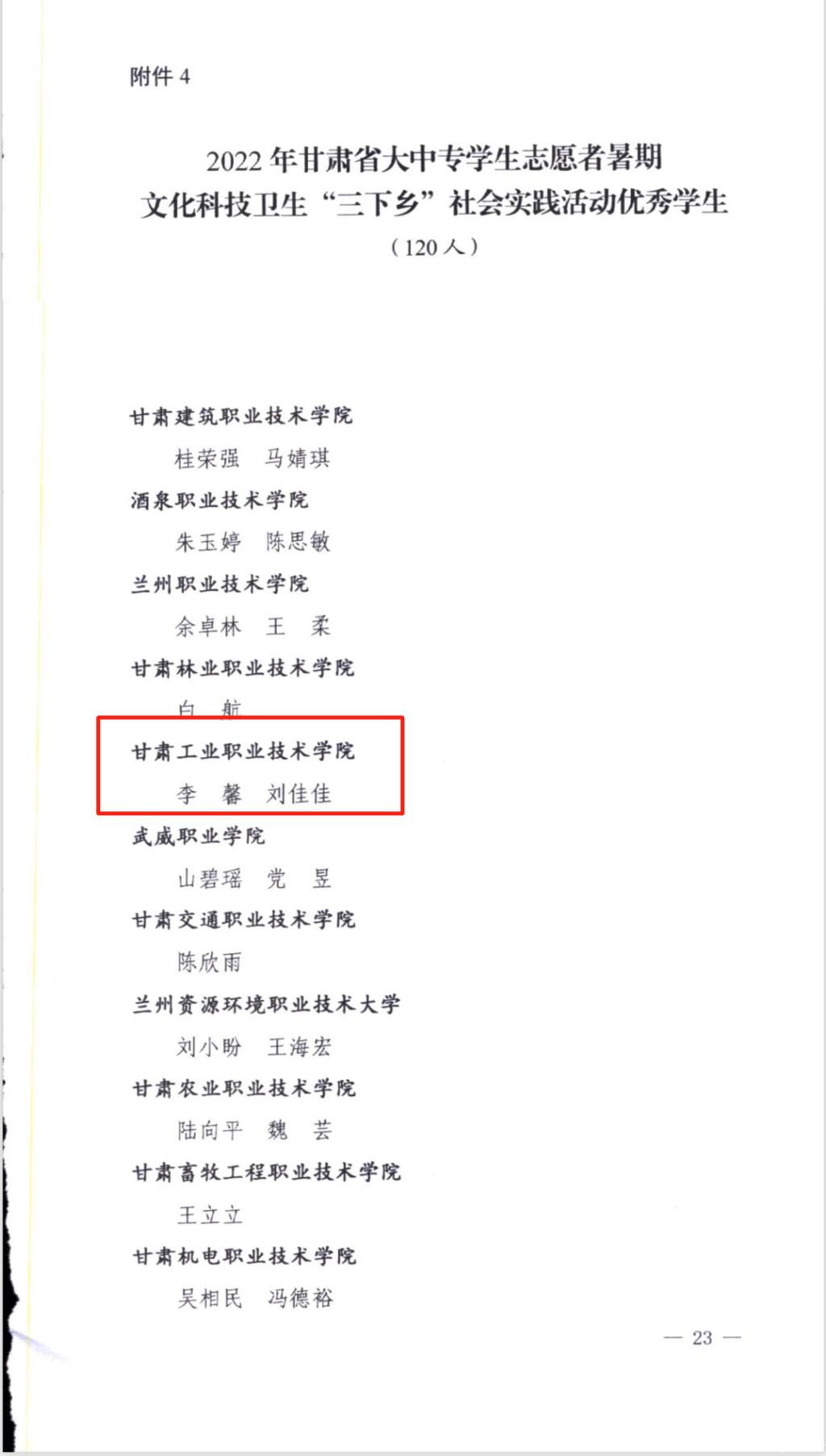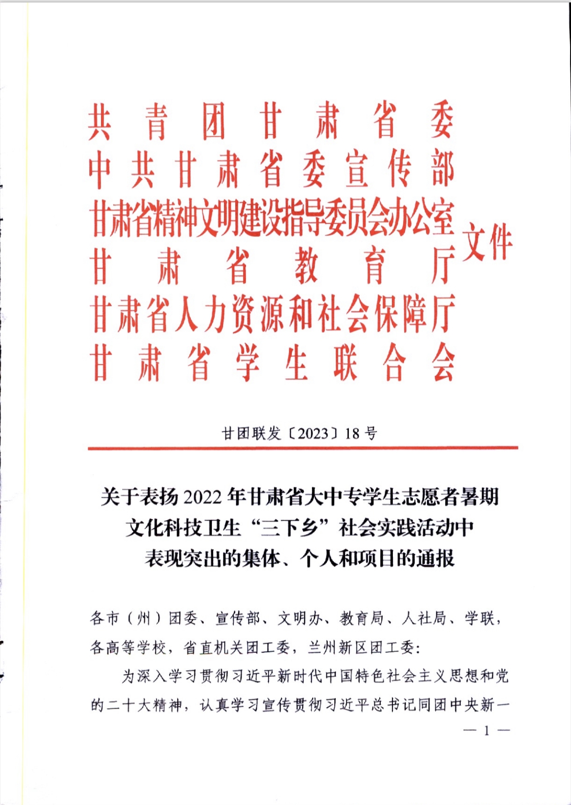 在2022年甘肃省大中专学生志愿者暑期文化科技卫生“三下乡”社会实践活动中,我校集体、个人和项目表现突出,获“优秀单位”、“优秀团队”、“优秀学生”多项荣誉,省委宣传部、团省委等单位通报表扬。其中我校团委荣获“优秀单位”称号。