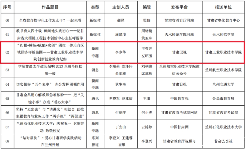 近日,中共甘肃省委教育工作委员会公布了“甘肃教育好新闻”评选活动获奖名单。我校报送的新闻作品《一所工业学院,一座工业城市》(发布于学校官方微信公众号)《“扎根+锤炼+赋能+实创”四位一体培育区域经济样板苗圃——pg娱乐电子游戏创新创业教育纪实》(发布于甘肃卫视)获评二等奖。