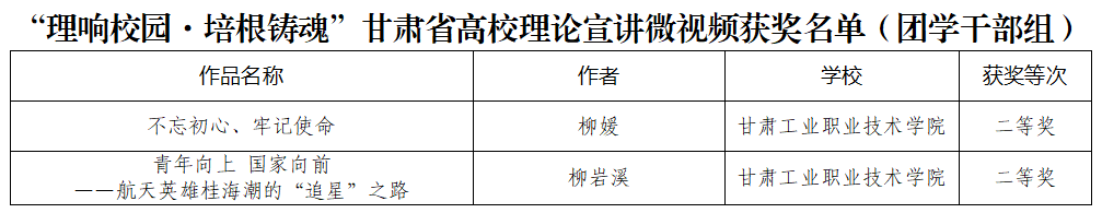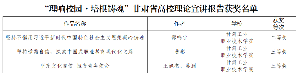 理论宣讲报告作品中,邵鸣宇的作品《坚持不懈用习近平新时代中国特色社会主义思想凝心铸魂》荣获二等奖,黄彬的作品《坚持道路自信,探索中国式职业教育现代化之路》,王旭杰、苏澜的作品《坚定文化自信 担当青年使命》荣获三等奖。理论宣讲微视频作品中,王莹芝的作品《十年铿锵步,中国新坐标》荣获党政干部组一等奖,李志杰的作品《青春之梦,奋斗之行:中国青年在奋斗中追梦》、李杨的作品《“伟大建党精神”永放光芒》分别荣获党政干部组二等奖;张琪的作品《书写好中国式现代化的青春答卷》荣获思政课教师组二等奖,冯凡琪的作品《青春的爱,奉献祖国——对话“时代楷模”黄文秀》荣获思政课教师组三等奖;杨博霞、宋志国的作品《红色基因映初心 半条棉被暖人心》荣获辅导员组二等奖,夏金祥、王启瑞、顿学斌的作品《担当时代使命 争做时代新人》荣获辅导员组三等奖;柳媛的作品《不忘初心、牢记使命》,柳岩溪的作品《青年向上 国家向前——航天英雄桂海潮的“追星”之路》分别荣获团学干部组二等奖;胡少杰、董颖的作品《平视世界 铿锵前行》荣获大学生骨干组二等奖;谯欣怡、任华荣的作品《不忘曾经烽烟起,而今屹立世界林》,李豆豆、刘恒的作品《青春筑梦未来 强国复兴有我》分别荣获大学生骨干组三等奖。