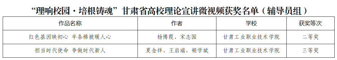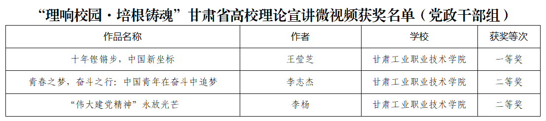 为深入学习贯彻习近平新时代中国特色社会主义思想和党的二十大精神,坚持不懈用党的创新理论铸魂育人,大力培养干部师生理论宣讲骨干,打造富有甘肃教育特色的宣讲品牌,着力培养堪当民族复兴大任的时代新人,9月至11月,省委宣传部、省委教育工委、团省委举办了“理响校园·培根铸魂”全省高校理论宣讲作品征集评选展示活动。经过专家组的严格评审,近期,省委教育工委公布了评审结果,我校共计15部作品获奖,分别荣获一等奖1项,二等奖8项,三等奖6项。