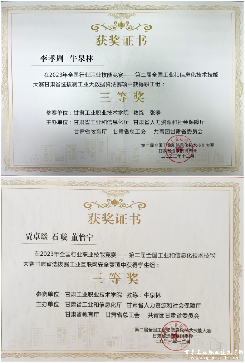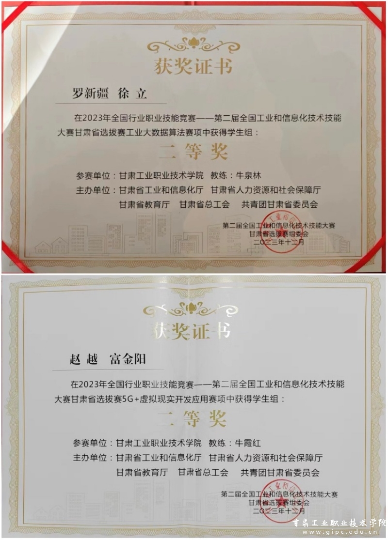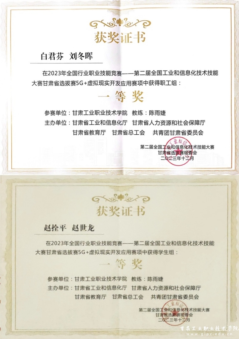 电信学院教师白君芬、刘冬晖获“5G+虚拟现实开发应用”赛项职工组一等奖,并被推荐为“甘肃省技术能手”“甘肃省五一劳动奖章”获得者。教师李孝周、牛泉林获“工业大数据算法”赛项职工组三等奖。