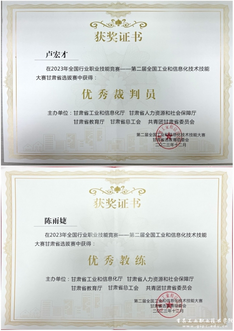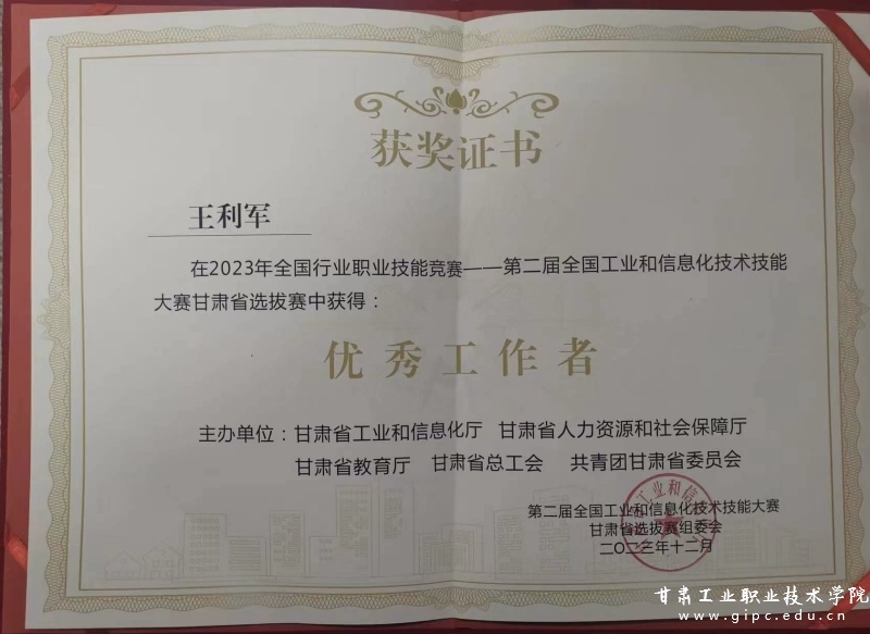 会议宣读了2023年全国行业职业技能竞赛——第二届全国工业和信息化技术技能大赛决赛我省获奖选手名单及甘肃省选拔赛获奖选手、单位名单,并进行颁奖;宣读了“甘肃省技术能手”“甘肃省青年岗位能手”“甘肃省五一劳动奖章”推荐说明。我校喜获一等奖2项、二等奖2项、三等奖2项,经过省赛选拔,我校1个职工组、2个学生组代表甘肃省参加全国大赛,并获2个三等奖的好成绩。