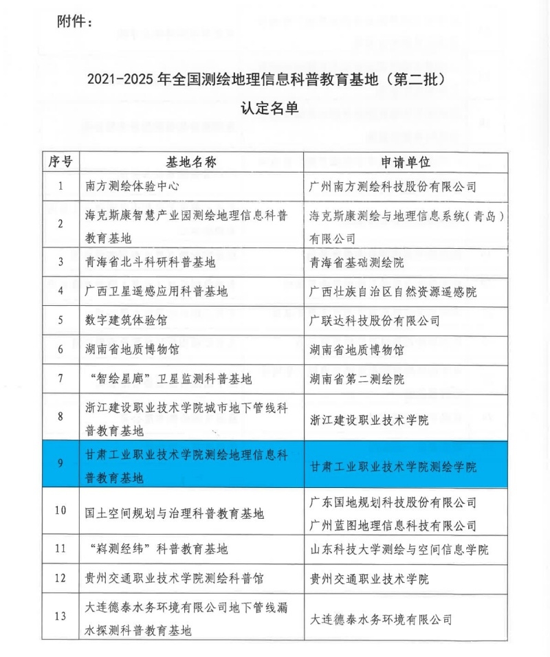 我校自1993年开始举办工程测量技术专业,是全省最早开设测绘类专业的高职院校,办学30余年来,为区域测绘产业和经济社会发展做出了积极贡献,积累了丰富的科普教育资源,此次入选“全国测绘地理信息科普教育基地”,是我院的发展历程中的一项重要成果,学院将以此为契机,进一步发挥办学优势,持续高质量推进测绘地理信息高水平专业群建设工作。
