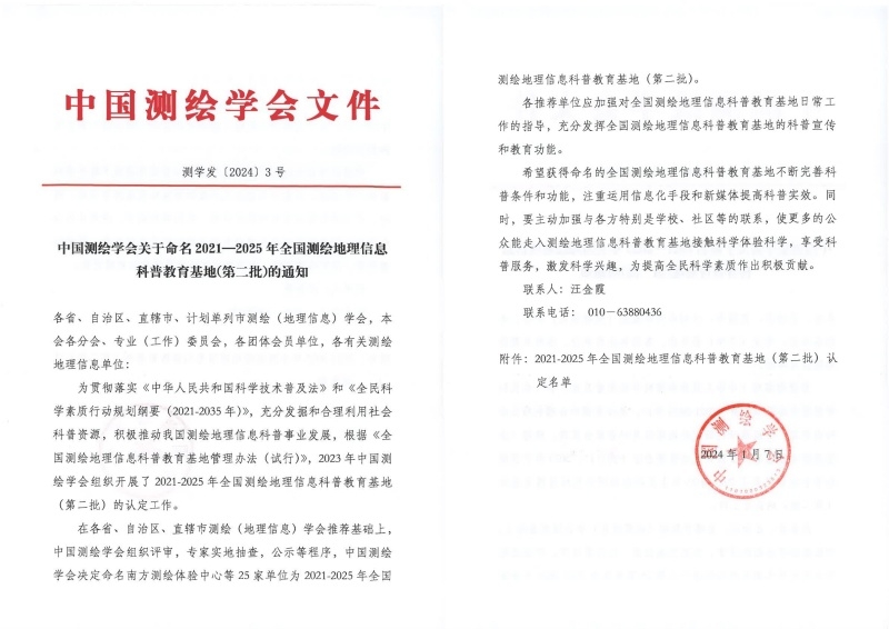 为贯彻落实《中华人民共和国科学技术普及法》和《全民科学素质行动规划纲要(2021-2035年)》,充分发掘和合理利用社会科普资源,积极推动我国测绘地理信息科普事业发展,根据《全国测绘地理信息科普教育基地管理办法(试行)》,2023年中国测绘学会组织开展了2021-2025年全国测绘地理信息科普教育基地(第二批)的认定工作。在各省、自治区、直辖市测绘(地理信息)学会推荐基础上,中国测绘学会组织评审,专家实地抽查,公示等程序,决定命名南方测绘体验中心等25家单位为2021-2025年全国测绘地理信息科普教育基地(第二批)。