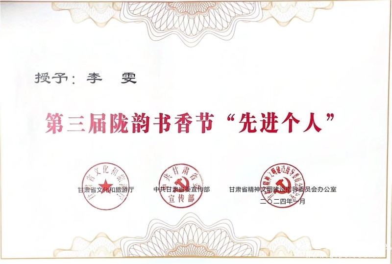 近日,中共甘肃省委宣传部、甘肃省精神文明建设指导委员会办公室、甘肃省文化和旅游厅颁发了第三届“陇韵书香节”全民阅读系列活动荣誉证书,我校图书馆李雯同志荣获“先进个人”荣誉称号。