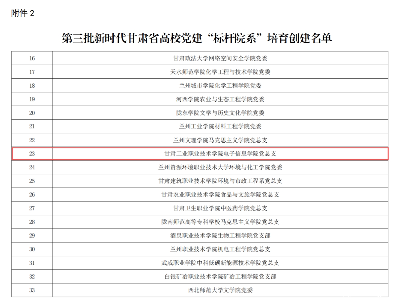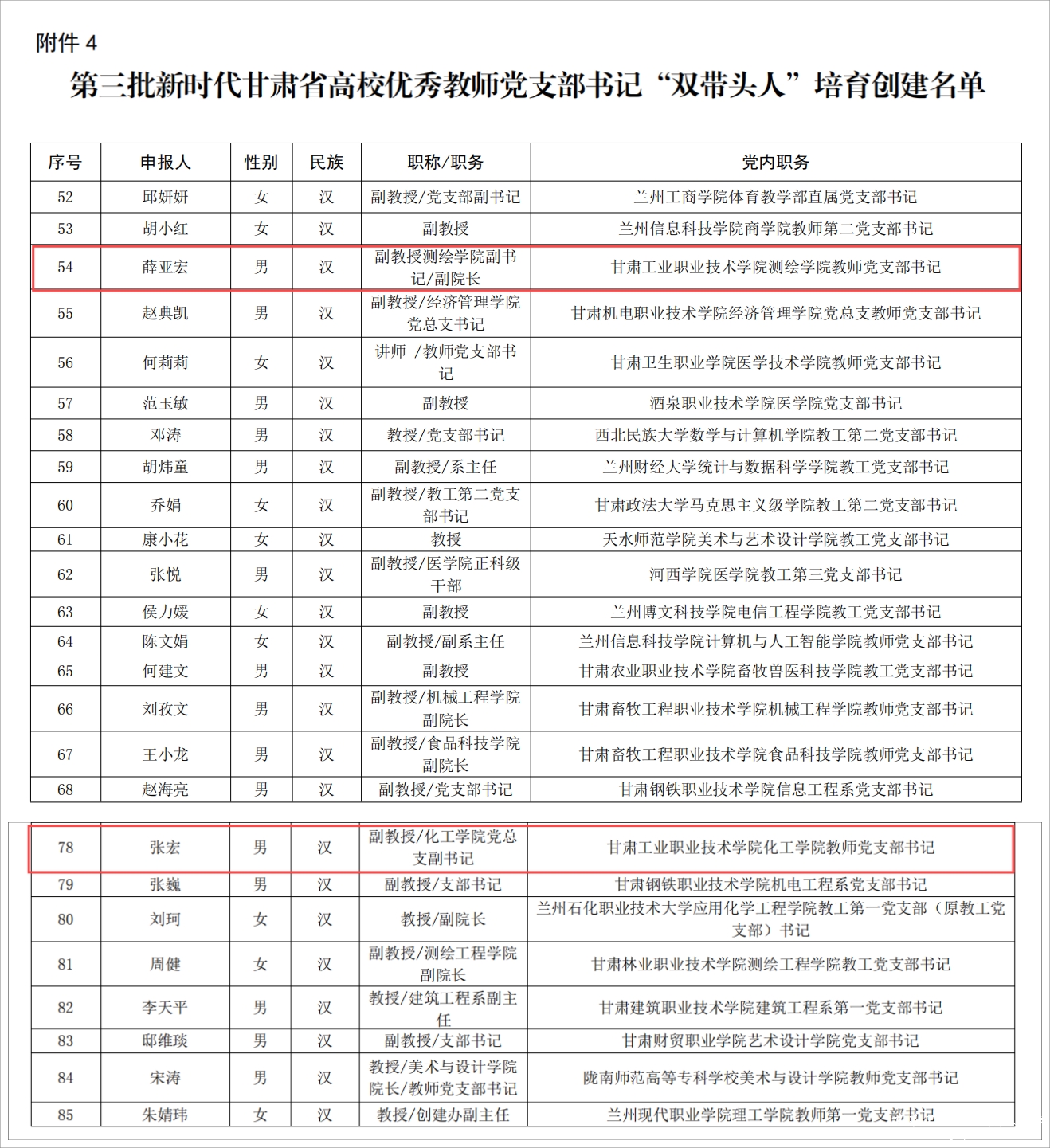 近日,根据省委教育工委公布的第三批新时代甘肃省大中小学党建“对标争先”创建单位名单的通知,我校电子信息学院党总支(原电信学院党总支)获批甘肃省高校党建“标杆院系”,我院教师党支部书记薛亚宏、化工学院教师党支部书记张宏2名同志获评甘肃省高校优秀教师党支部书记“双带头人”称号。