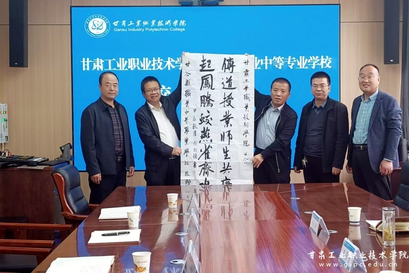 会后,由甘谷县职业中等专业学校教师张弘扬(中国书法协会会员,甘肃省书法协会教育委员会副秘书长,天水市书法协会副主席)题赠墨宝一幅,表达了对两校合作的美好期望。