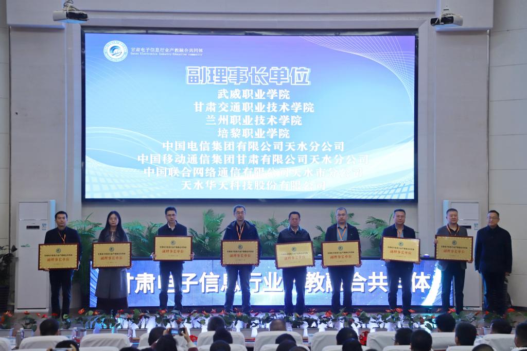 11月8日,甘肃电子信息行业产教融合共同体成立大会在我校成功举办。工业和信息化部教育与考试中心处长陈涛,甘肃省工业和信息化厅副厅长陶英平,甘肃省教育厅二级巡视员牛辉峰,天水市人民政府党组成员、副市长汪小娟,丝绸之路信息港股份有限公司副总经理郭立平,兰州交通大学党委常委、副校长朱廷珺,甘肃省职业技术教育中心主任李博,甘肃省工业和信息化厅电子信息与软件服务业处副处长齐婕等出席大会,省内外相关高校、职业院校、企业单位及师生代表300余人参加。大会由学校党委副书记、院长张利军主持。
