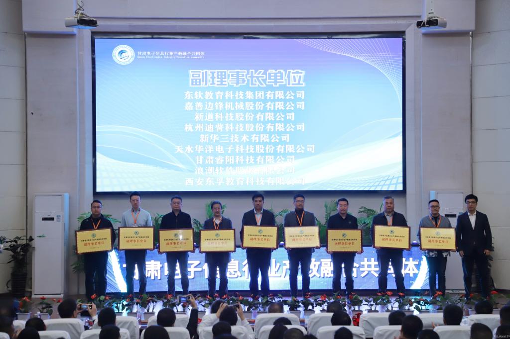 会上,与会领导共同按下启动键,宣布甘肃电子信息行业产教融合共同体成立,并为理事长、副理事长及理事单位授牌。会后,兰州交通大学电子与信息工程学院严天峰教授、浪潮软件股份有限公司西北区营销总监高丙辉分别作了主旨演讲。
