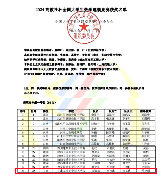 11月11日,2024“高教社杯”全国大学生数学建模竞赛获奖名单出炉。我校电子信息学院学子在此次竞赛中荣获高职高专组国家一等奖。
