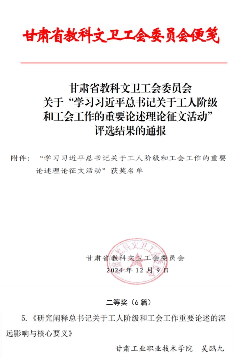 为深入学习贯彻习近平总书记关于工人阶级和工会工作的重要论述,甘肃省教科文卫工会委员会于2024年6月启动《学习习近平总书记关于工人阶级和工会工作的重要论述理论征文活动》,我校工会组织教师积极参与,共投稿17篇,展现出对相关理论学习研究的高度热情。最终化工学院教师吴鹏九荣获二等奖,为学校争得荣誉。