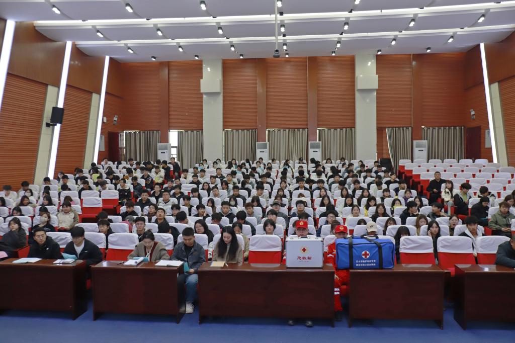 讲座结束,开始了模拟地震消防演练,随着警报声声响起,师生迅速反应,依照预案有序撤离,整个过程组织严密、行动规范,达到了预期效果。演练结束后,宋明宇在现场为师生进行了急救知识与心肺复苏实操培训。他详细讲解操作流程,并借助模拟人进行示范,学生们积极参与实践,掌握了胸外按压、人工呼吸等关键技能,切实提升了“黄金四分钟”内的应急救援能力。