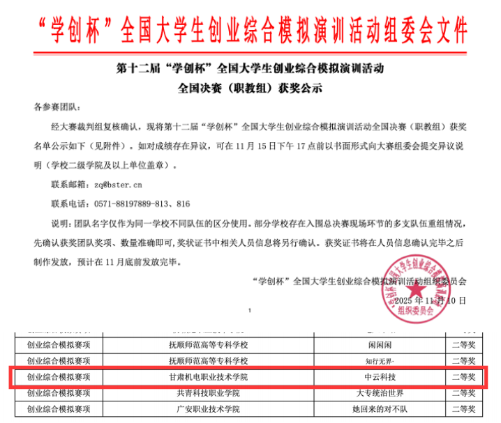 近日,第十二届“学创杯”全国大学生创业综合模拟演训活动全国总决赛(职教组)圆满落幕。经过激烈角逐,我校选派的学生团队在创业综合模拟赛项中荣获全国二等奖。同时,学校荣获甘肃省教育厅授予的“优秀组织单位”。
