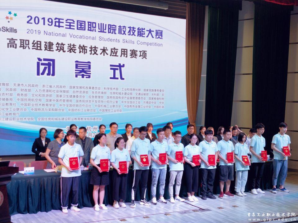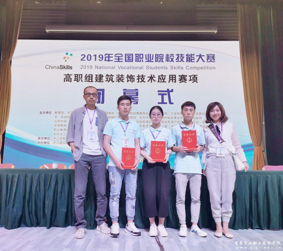 5月31至6月2日,2019年全国职业院校技能大赛高职组建筑装饰技术应用赛项在浙江建设职业技术学院举行。本次大赛为期三天,有来自全国28个省、市、自治区、新疆生产建设兵团的79所参赛院校代表队共计237名选手同台竞技。经过激烈地角逐,我校艺术学院建筑装饰工程技术专业王先河、刘琰老师辅导的苏敬俊、龚丽萍、闫双虎三名学生凭借扎实的专业理论知识、熟练规范的软件技能操作、较强的团队协作能力最终荣获三等奖。