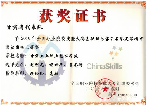经过激烈角逐,由我校地质学院钱玲玲、高翔两位老师指导的宝玉石鉴定与加工专业学生刘明虎、杨世华、董冬彩凭借扎实的基础理论知识、规范标准的技能操作和良好的团队协作,最终荣获团体三等奖。