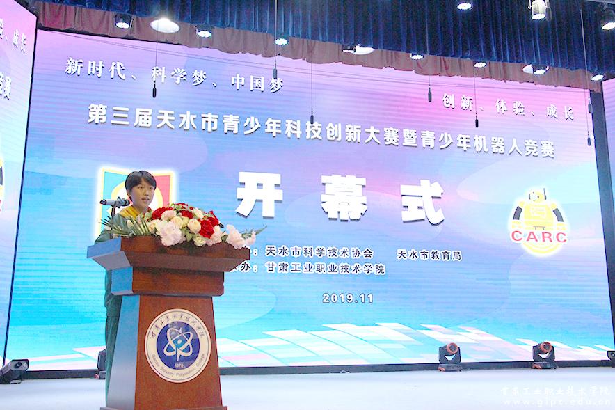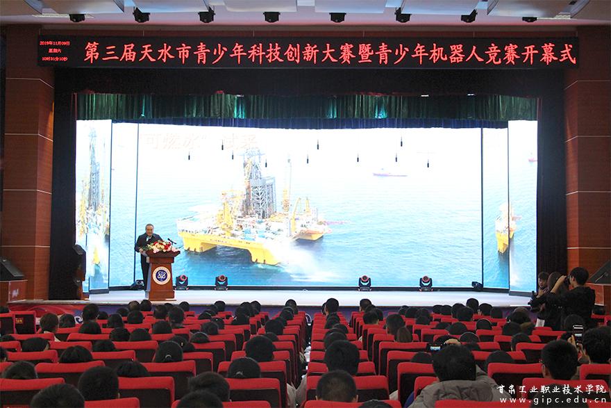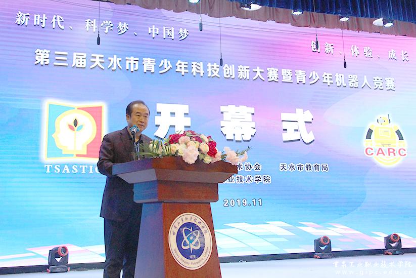 校党委书记杨声致辞,他代表学校向专程莅临我校指导工作的天水市委、市政府、人大、政协的各位领导及参赛选手和教师表示热烈欢迎,向多年来一直支持学校发展的天水市科学技术协会、市教育局的各位领导表示衷心感谢。杨声指出,pg娱乐电子游戏作为一所植根天水的地方高校,终以科技创新工作为己任。近年来,学校紧密对接国家创新驱动发展战略,立足产教研深度融合和创新创业教育,以甘肃省优质高职院校建设为契机,不断优化专业设置、创新人才培养方案、出台科研创新制度,全面实施了学校专业建设和科研创新2.0版提升工程,学校教育教学和科研创新能力明显提高。在做好自身教育教学和科技创新工作的同时,也非常注重为地方经济社会发展服务。学校已经连续成功举办两届全市青少年科技创新大赛,成为展示我市青少年科技创新成果、培养科技创新人才的重要赛事。作为本次全市青少年科技创新大赛的承办单位,学校将尽心竭力,为大赛做好各项服务保障工作,努力把本届大赛办成一次富有成果、精彩圆满的大赛。