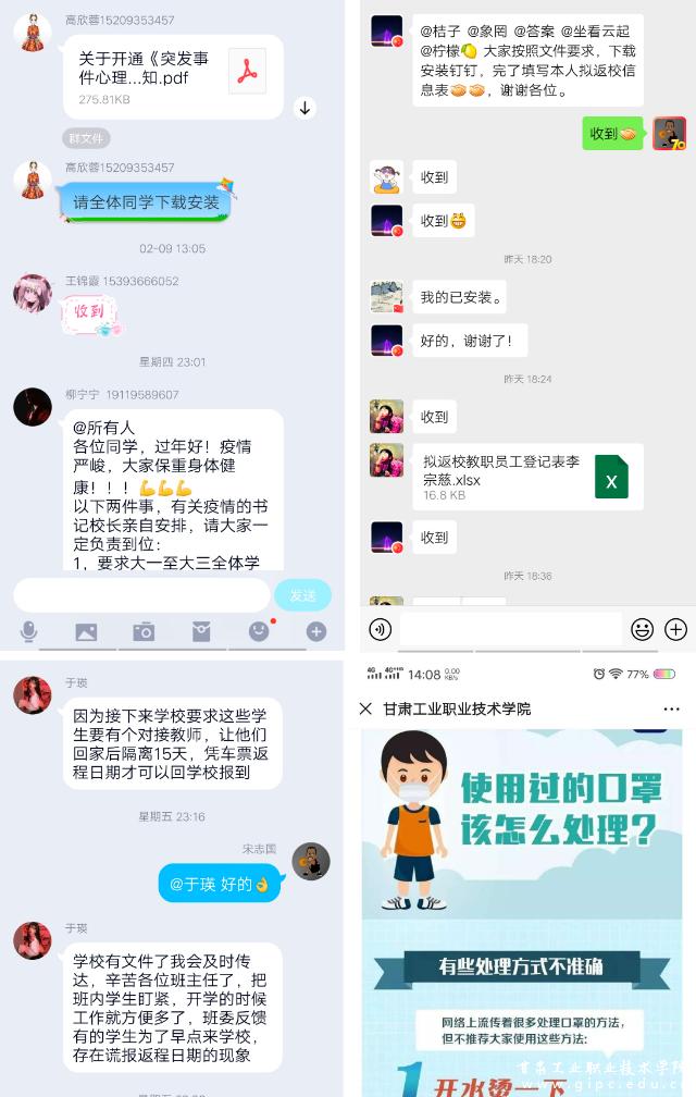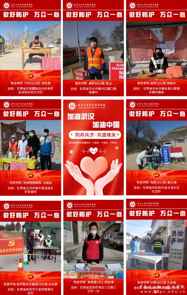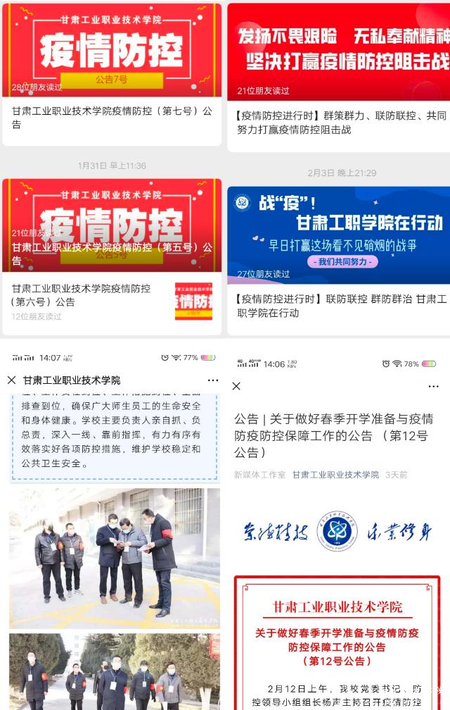 学校充分发挥先进典型的激励作用,让党旗飘扬在抗击疫情一线。宣传部门紧紧围绕“大学生志愿服务”、“党员先锋队”、“心理咨询室”等公益服务志愿活动,进一步夯实基层组织的战斗堡垒作用和共产党员的先锋模范作用,激发全院师生坚定信心、众志成城防控疫情、战胜疫情。我校多次在官网、新媒体、抖音上宣传报道党员干部、1231马克思主义理论武装工作学生成员、入党积极分子以实际行动让党旗高高飘扬。一个个鲜活的典型形象、一个个生动的感人故事,都是甘肃工职学院军工精神的生动写照。