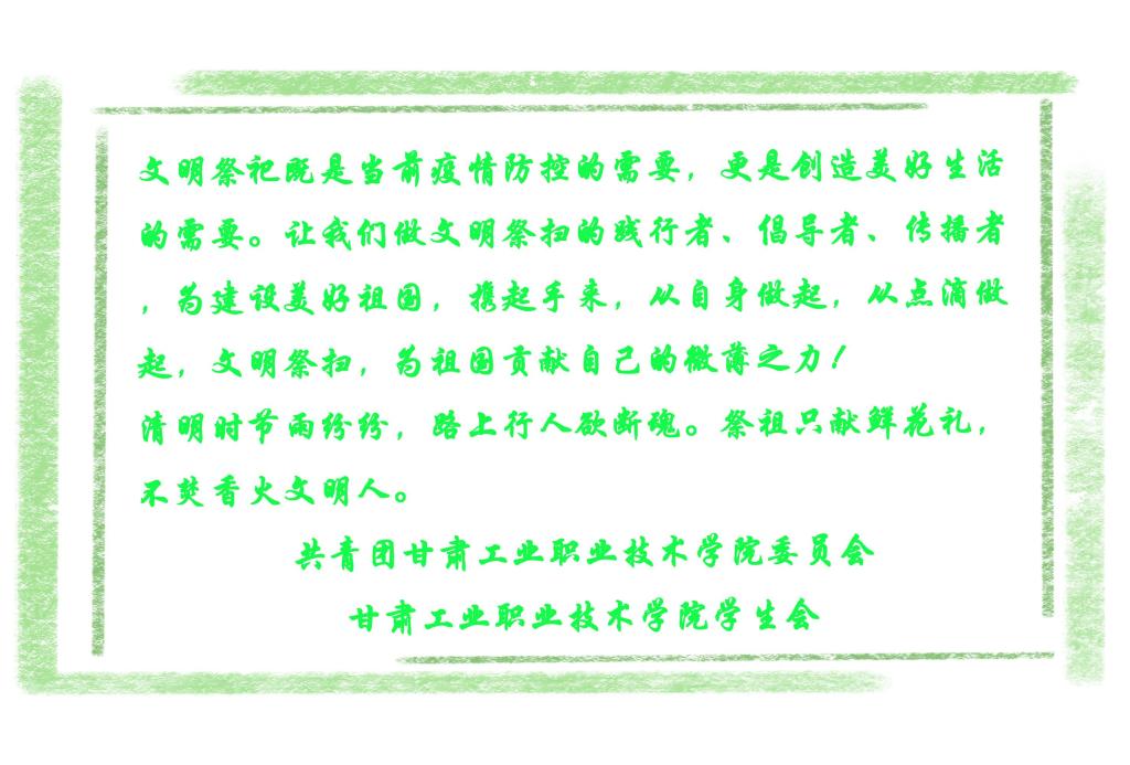 清明将至,在疫情防控的特殊时期,由校团委、学生会发起的“缅怀革命先烈、倡导文明新风”倡议及云祭奠先烈活动,旨在让全体学生自觉摒弃不文明的祭祀行为,做文明祭祀的践行者、宣传者,并通过“云祭奠”扫码浏览我省爱国主义教育基地,缅怀革命先烈,做英烈精神的传承者。 “缅怀革命先烈、倡导文明新风”倡议书 (供稿:校团委 摄像:校团委 编辑:万腾飞 编审:胡森林)