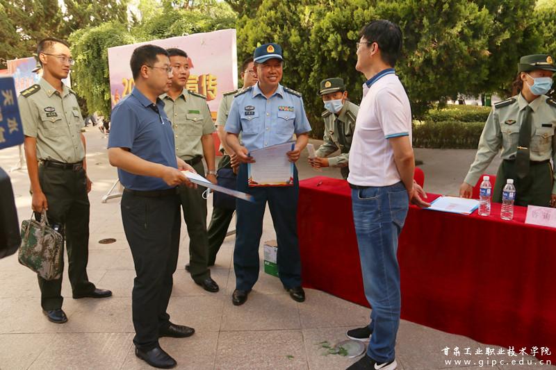 宣讲会结束后,李根来部长和校党委副书记郭建忠等人参加了我校大学生征兵宣传活动,并为我校学生发放《2020年征兵宣传册》。