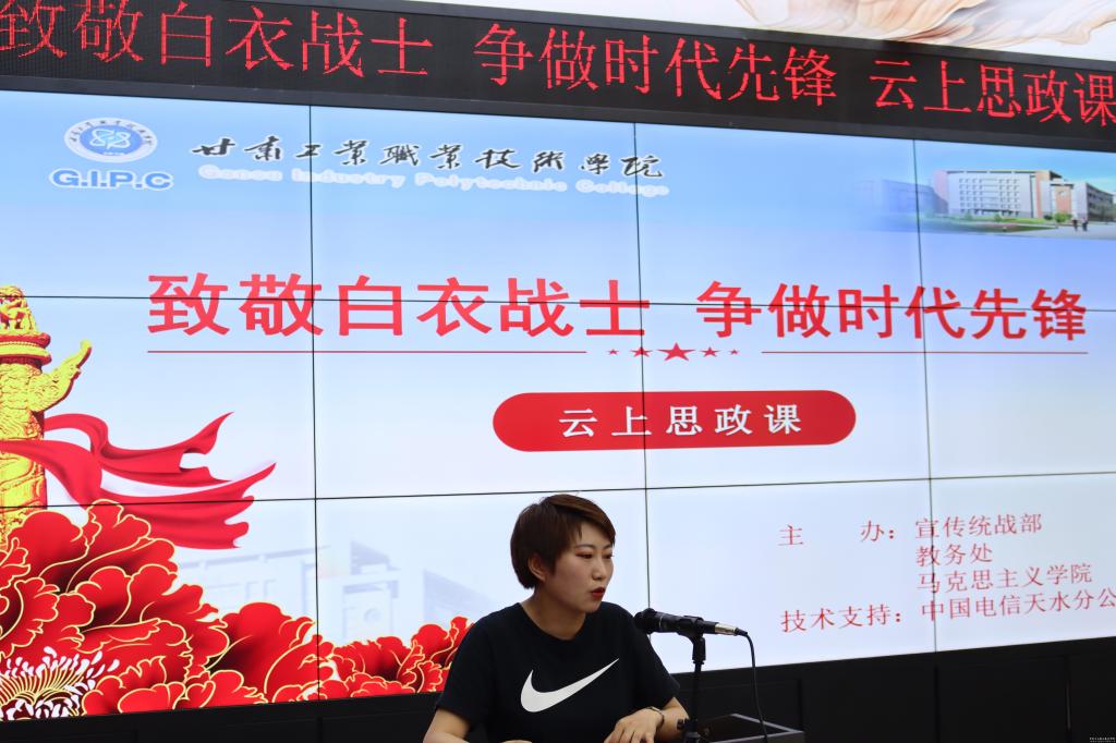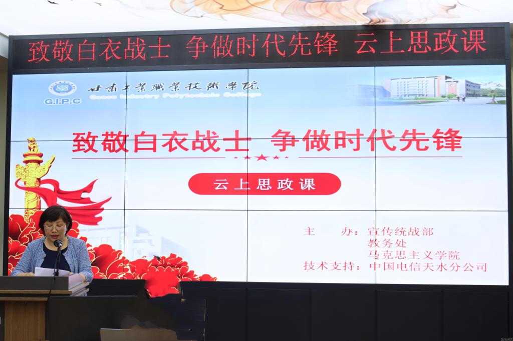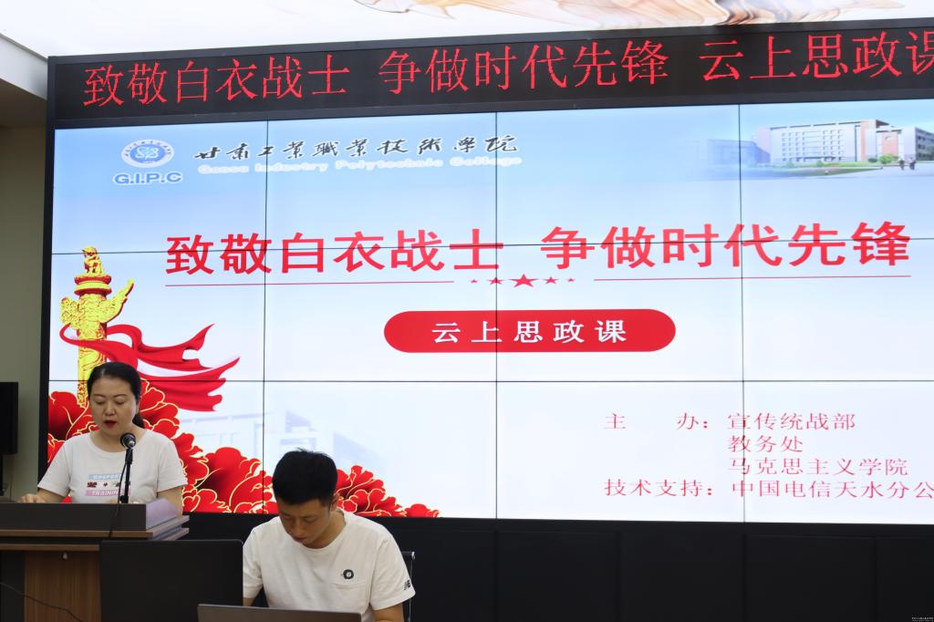 为深入推动习近平总书记抗“疫”系列重要讲话精神进校园、进课堂,传递战“疫”正能量,弘扬抗疫精神,引导广大青年学生向逆行出征的白衣战士学习,激励广大青年勇于担当,争做时代先锋,6月23日晚19:30分,由宣传统战部、教务处和马克思主义学院共同举办的“致敬白衣战士,争做时代先锋”抗击疫情专题思政课在我校文秘实训室顺利开讲。由中国电信天水分公司提供技术支持,2018级、2019级全体学生通过“大学小帮手”扫码注册、关注“大学小帮手”微信公众号等在线观看直播。