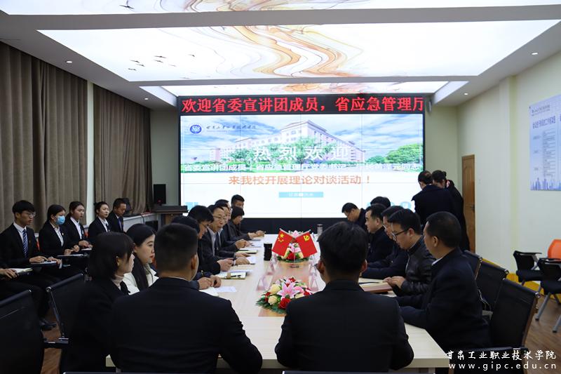 11月25日,学习贯彻党的十九届五中全会精神省委宣讲团理论对谈会在我校举行。省委宣讲团成员、省应急管理厅党委书记、厅长黄泽元一行7人出席会议,会议由校党委书记杨声主持,党委班子其他成员郭建忠、潘文生、杨建国出席,宣传统战部、马克思主义学院、校团委负责人及师生代表参加会议。