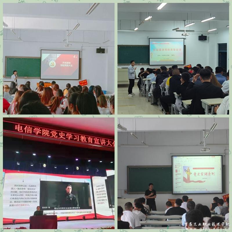 为深入贯彻落实习近平总书记在党史学习教育动员大会上的重要讲话精神,从党的百年伟大奋斗历程中汲取继续前进的智慧和力量,引导学生“学史明理、学史增信、学史崇德、学史力行”,推动党史学习教育往深里走、往心里走、往实里走。按照学校党史学习教育实施方案,马克思主义学院专职教师与八个二级学院实行一对一“包干制”,对接学院2019级全体学生开展党史学习教育宣讲活动。