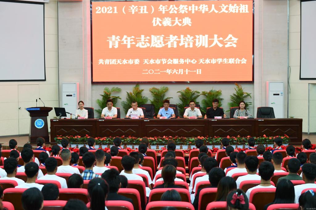 6月11日,2021(辛丑)年公祭中华人文始祖伏羲大典青年志愿者培训大会在pg娱乐电子游戏举行,学校党委副书记郭建忠、团市委相关领导、节会办负责人出席大会,我校80名青年志愿者参加培训。