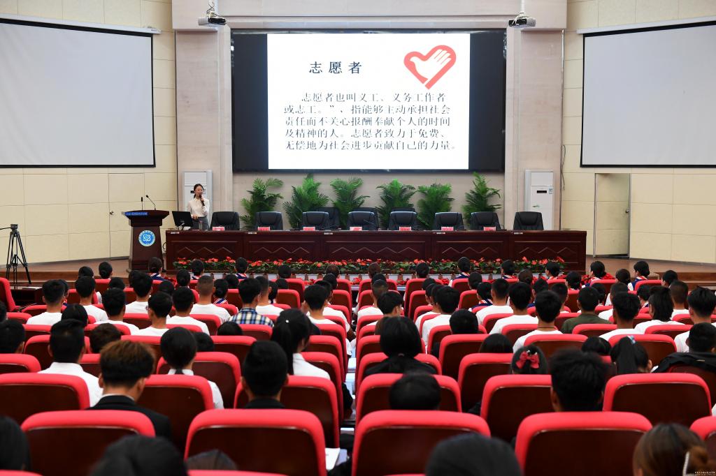 我校青年志愿者在会上庄重宣誓。随后,国家高级礼仪培训师、高级茶艺师、中国女性形象公益讲师团讲师席春媛对青年志愿者进行了礼仪课程培训。