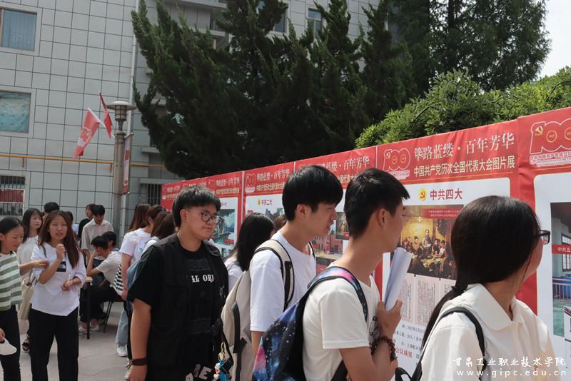 在大学生活动中心前,有22块宣传板十分醒目。庆祝中国共产党成立100周年的活动标识及内容解读让人心生肃穆,图文并茂的中国共产党历次代表大会的简介和党领导下取得的社会主义建设的伟大成就让人激动、自豪。行者驻足、观者深思,中国共产党的百年历程,就是团结带领人民为实现中华民族伟大复兴而接续奋斗的历程。