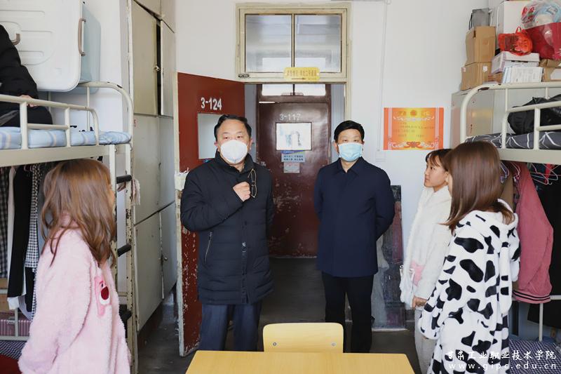 杨声一行先后深入学生1、2、3号公寓,现场检查了学生宿舍、浴室、卫生间等公共区域的消杀情况,并随机走访学生宿舍,与同学们面对面交流,详细了解同学们的日常生活和线上学习情况。