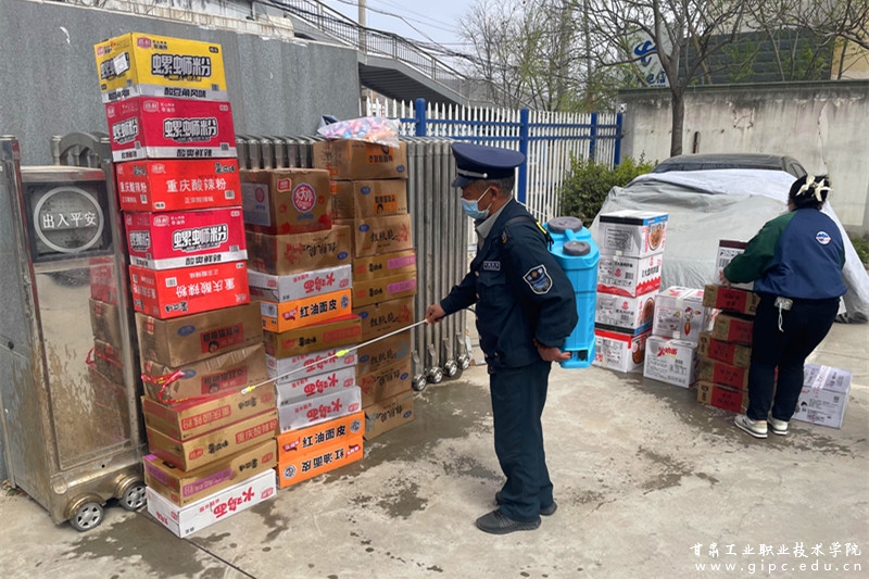 疫情发生后,学校保卫处将校园安全工作关口前移,实行24小时双岗值班。对校园封闭管理期间出校人员及进出车辆进行严格排查管控;对进校餐饮食材等物资车辆按照程序严格进行登记、检查、消杀;组织餐饮工作人员分批次取货,严防死守,切实做到“守住门、盯住人、把好关”。面对疫情,全体安保人员无所畏惧、勇往直前,坚决落实好学校党委部署,以最严格的防控措施把好校园关口,他们也是疫情面前的“逆行者”,为他们点赞。