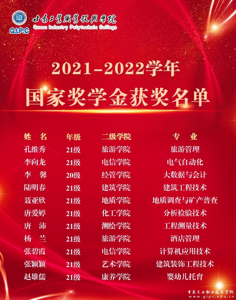 近日,教育部公布全国2021—2022学年国家奖学金获得者名单,我校孔维秀等11名学生经层层选拔,荣获2021—2022学年国家奖学金。