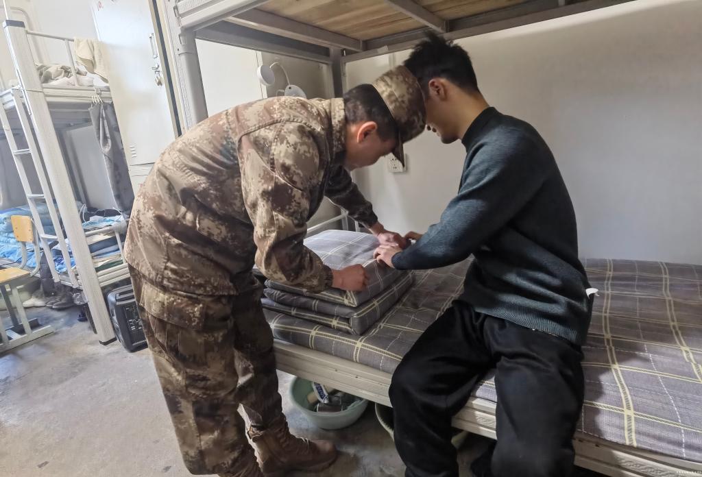 为持续做好退役复(入)学学生思想引领和服务保障工作,坚持“退伍不褪色、退役不退志”,一以贯之地发扬人民军队的光荣传统和优良作风,在同学中发挥表率带头作用,12月27日,建筑学院组织退役复(入)学“三拥团”深入学生宿舍进行内务指导,帮助同学们营造良好的宿舍环境。