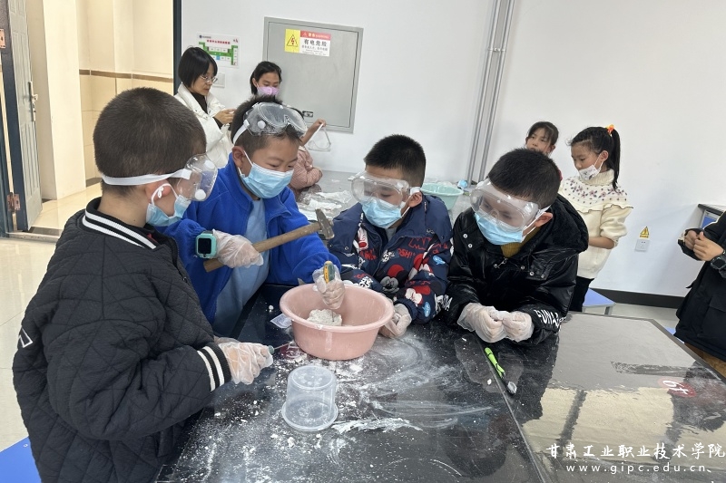 在地质寻宝实验中,同学们分组进行实验,团结协力完成实验过程。在科普工作人员的指导下,孩子们通过亲手操作,了解化石稀少、偶然的特性,体验地质工作中挖掘化石的过程。