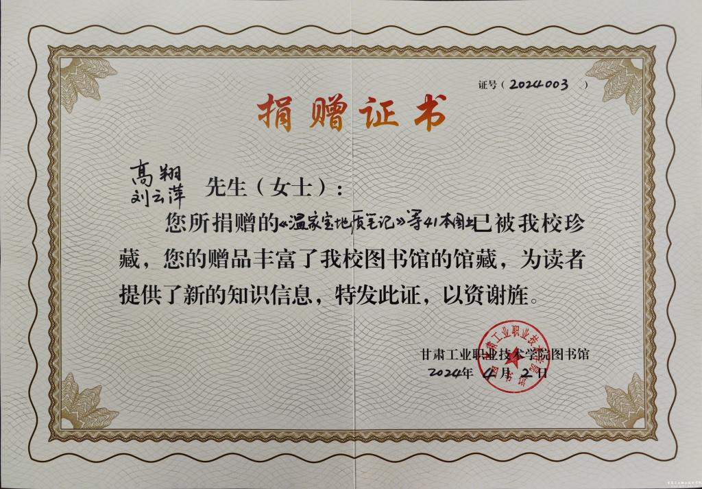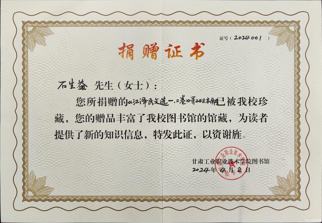 在本次捐赠中,科技处处长石生益向校图书馆捐赠了《习近平谈治国理政(一至四卷)》、《中国改革战略研究文汇(上下卷)》、《江泽民文选(一、二卷)》、《习近平七年知青岁月》等书目共248册。退休教师高翔、刘云萍捐赠了《温家宝地质笔记》、《计算机百科全书》、《百年大党的光辉实践与历史启示》、《丁玲作品精选》、《日语语法》等书目共41册。张斌权教授先期捐赠了《桩基工程技术发展2009》、《中国共产党天水市组织史资料(第三卷)》等书目,其他图书仍在整理中。