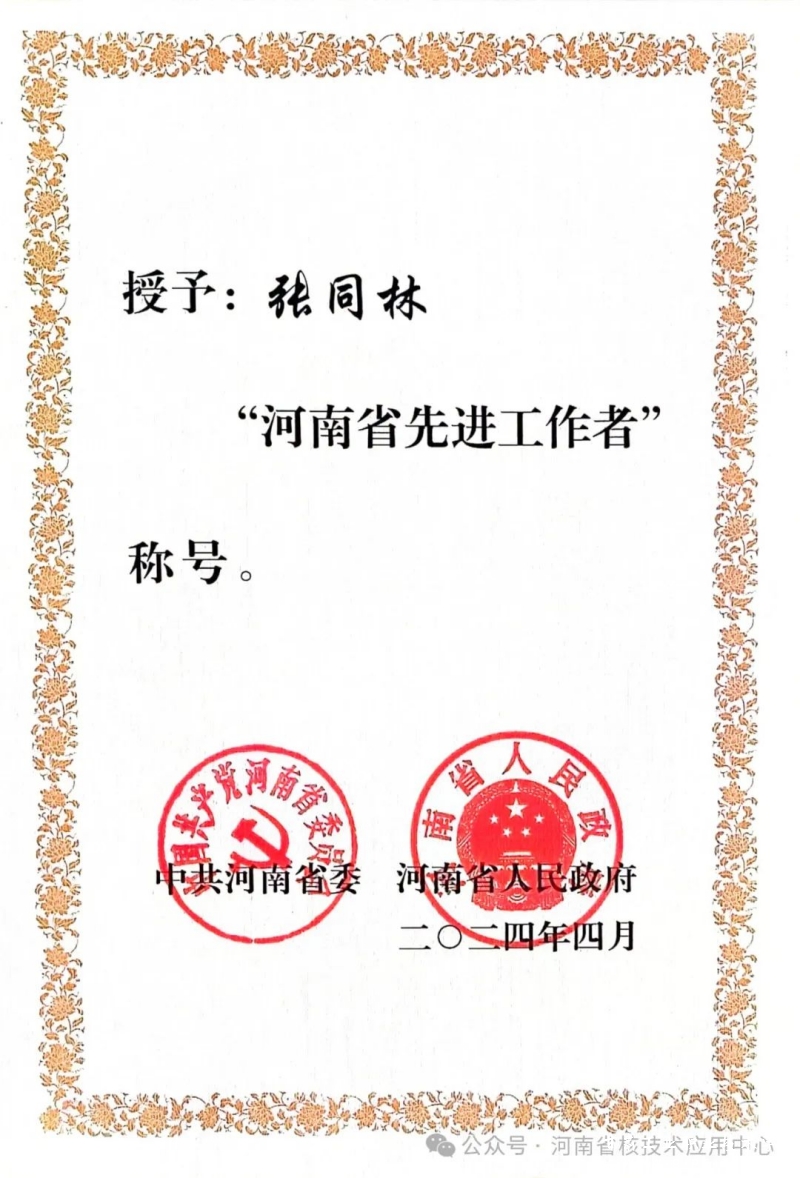 4月30日,2024年庆祝“五一”国际劳动节暨表彰河南省劳动模范和先进工作者大会在郑州隆重举行。我校杰出校友河南省核技术应用中心正高级工程师张同林同志在会上受到表彰,荣获“河南省先进工作者”称号。