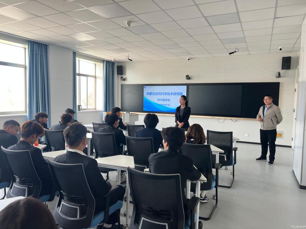 为深化校企合作、促进产学研深度融合,4月15日下午,内蒙古政司科学技术研究院校园宣讲会在 我院党建活动室举行。本次活动以“科技赋能青春,携手共赴未来”为主题,聚焦自然资源管理、生态环境治理、智慧能源开发等前沿领域,吸引了来自工程测量、地理信息技术等专业的100余名师生参与。