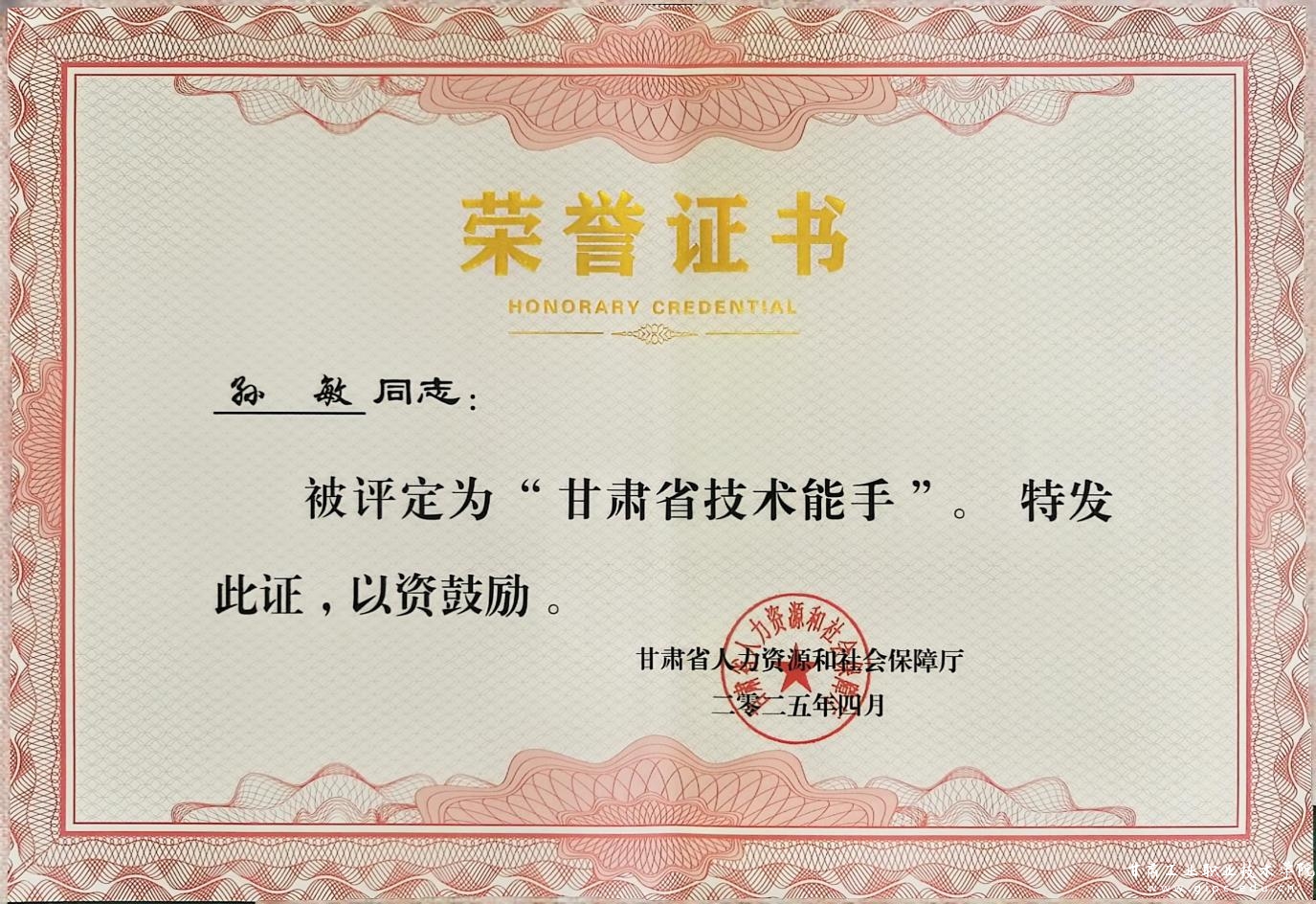 “甘肃省技术能手”评选活动旨在激励广大劳动者坚定技能成才之路,营造崇尚技能、尊重人才的良好氛围。此次评选历经个人申报、单位推荐、严格的资格审核以及公示等层层严谨流程,在激烈的竞争中,孙敏老师凭借扎实的专业功底和出色表现成功入选,实属不易。