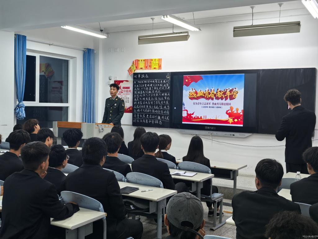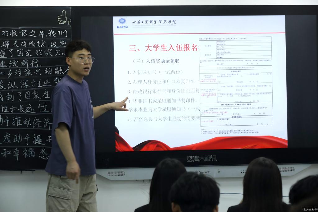 宣讲会上,入伍专干柳兴围绕征兵政策展开详细讲解,重点介绍了报名流程、身体条件、年龄要求等关键信息,并就学费补偿、国防奖学金发放、升学优惠、就业扶持等优抚政策进行举例说明。鼓励同学们积极投身军旅,在军队中锤炼自我,以实际行动为国防事业贡献力量。