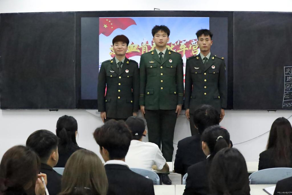 退役复学学生代表康俊杰等5名学生分别从自身入伍经历、军营磨炼、个人成长等方面为大家做了汇报和分享,充分反映了当代青年投身军营的使命担当。康俊杰表示,“退伍不褪色,要把学习和今后的工作当作新的战斗岗位,再立新功,创造辉煌,展现退役士兵学生对党对人民的忠诚担当。”“在部队中,我们不仅学习到了格斗技能,更重要的是学会了如何直面各种挑战,并且拥有了面对困难时的勇气”,退役重返校园的学生贾涛涛通过分享他在边疆的戍边故事,向我们展示了野外拉练、战术训练等日常的军事训练场景,生动地诠释了“迷彩青春”所承载的责任与担当。退役复学学生蒋剑锋也表示:“部队教会了我严明的纪律性,这让我在未来的道路上能够更好地承受各种压力。”退役复学学生代表的发言深深触动了在场的青年们,引起了他们的强烈共鸣。