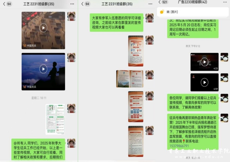 活动期间,各班班主任紧紧围绕法律义务、征集条件、应征指南、优待政策和发展路径等五个方面,充分利用腾讯会议、微信的便捷性,与学生实现“云端”相聚,旨在为25届毕业生清晰解读征兵政策,激发他们的参军热情。
