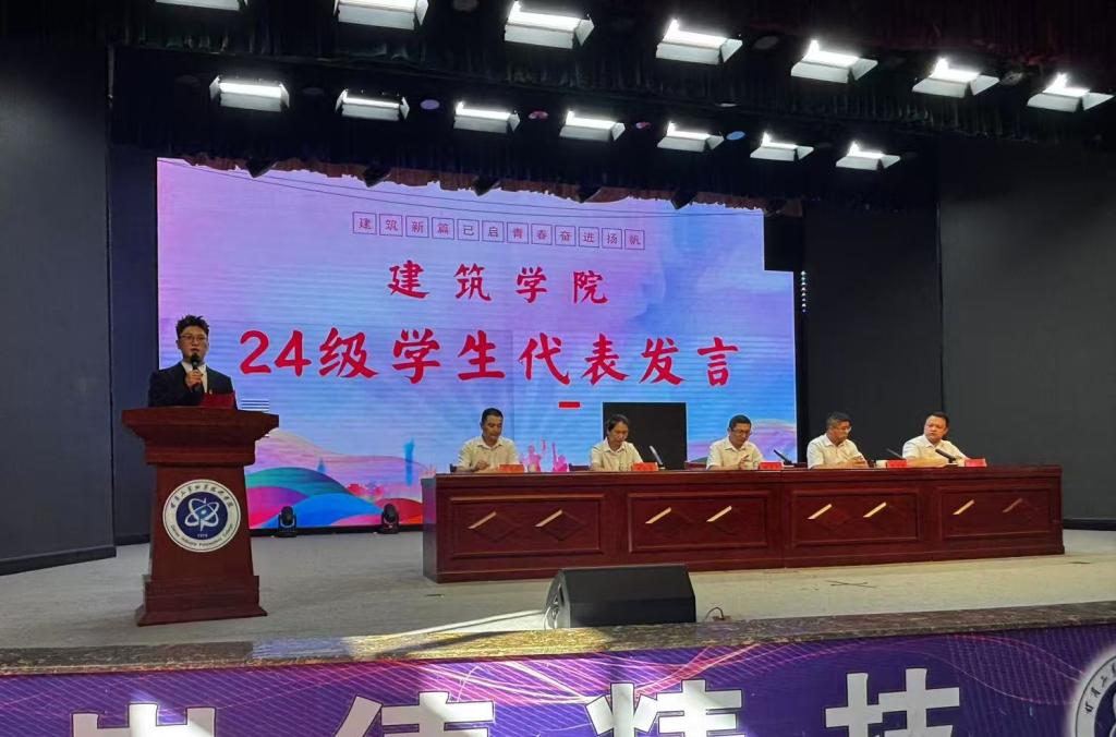 随后,2025级新生代表上台发言,言语间满是对大学生活的憧憬与对建筑专业的热爱。她提到,从收到录取通知书的那一刻起,“建筑”二字便在心中有了特殊的分量,表示将以谦逊的态度学好每一门专业课程,积极参与学科竞赛与实践活动,向老师请教、向学长学习,努力从“建筑萌新”成长为能扛起责任的未来建筑人。同时,她也呼吁全体新生并肩同行,在相互鼓励中克服学习难题,在共同探索中感受建筑学科的魅力,不辜负学院的培养与家人的期待。