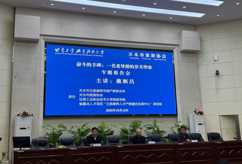 10月13日,由天水市文旅康养市域产教联合体、天水市旅游协会、甘肃工业职业技术大学旅游学院、省重点人才项目“文旅康养人才产教融合实践中心”项目组共同承办的“奋斗的丰碑:一名老导游的岁月华章”专题报告会在学校智敏报告厅举行。天水市旅游协会会长、天水旅游培训中心主任王浩瑜,社会导游代表以及旅游学院在家班子成员出席活动,旅游学院全体师生参加。