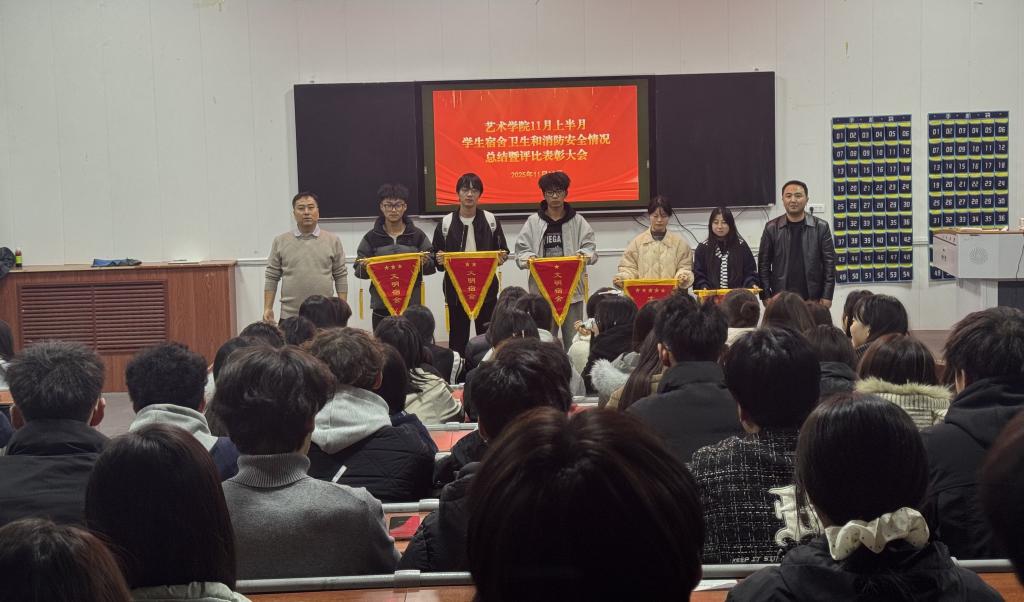 会议宣读了艺术学院文明宿舍创建活动实施方案,通报了艺术学院11月上半月学生宿舍卫生和消防安全情况,并为评选出的5个文明宿舍进行表彰授旗。