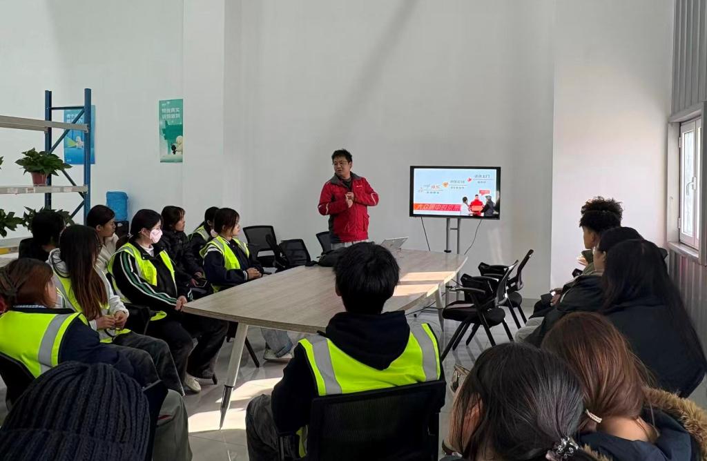 实习初期,企业为学生安排了系统化岗前培训。京东资深培训师通过专题讲座,全面介绍公司发展历程、供应链运营模式、核心业务布局及行业前沿趋势,帮助学生构建对物流行业的整体认知。随后,由一线带教师傅开展“一对一”实操指导,详细讲解分拣流程、设备操作规范与货物分类标准,覆盖扫码识别、异常处理等关键环节,夯实学生岗位技能基础。同步开展的安全培训围绕仓库消防、搬运规范与应急预案等内容,采用“理论+案例+实操演练”相结合的方式,全面筑牢实习安全防线。