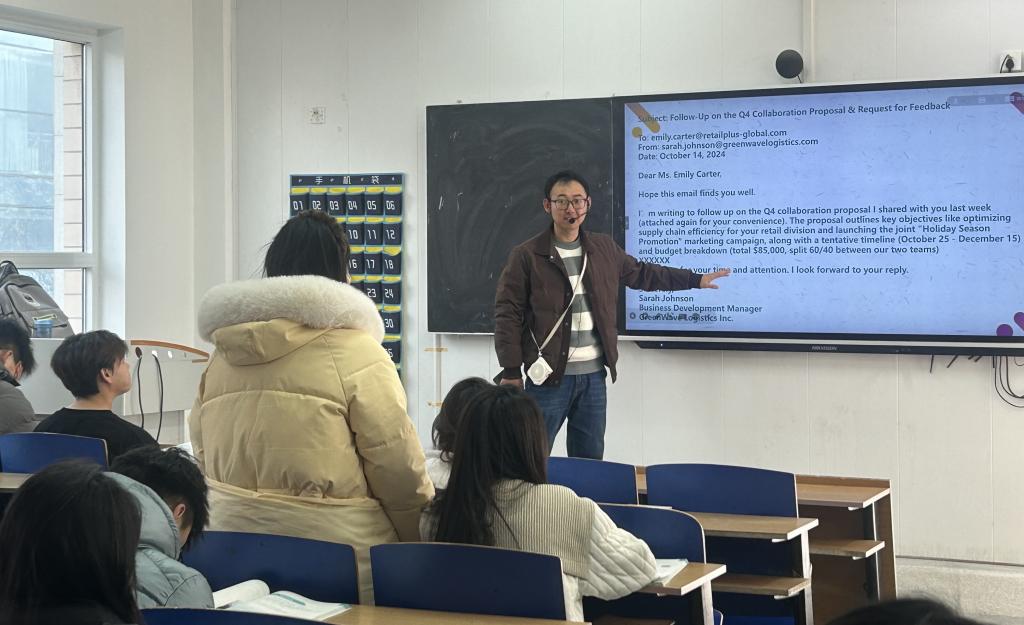 青年教师听评课环节,语文教师辛莹莹在《提醒幸福》一课中,以亲切自然的教态引导学生品读文本、感悟生活,鼓励学生分享对幸福的体会,体现了课堂中的人文关怀与情感渗透;英语教师同亮以真实企业信函为案例,讲授“商务信函翻译”,通过对比分析、小组协作等方式,将翻译技巧转化为清晰可行的步骤,注重学生实践能力的培养。