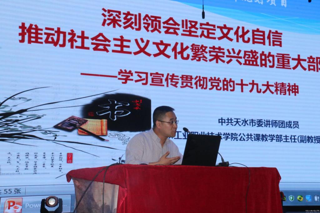 4月24日,公共课教学部主任胡森林,在大学生活动中心为2018级学生作题为《深刻领会坚定文化自信推动社会主义文化繁荣兴盛的重大部署——学习宣传贯彻党的十九大精神 》的形势与政策课专题讲座。
